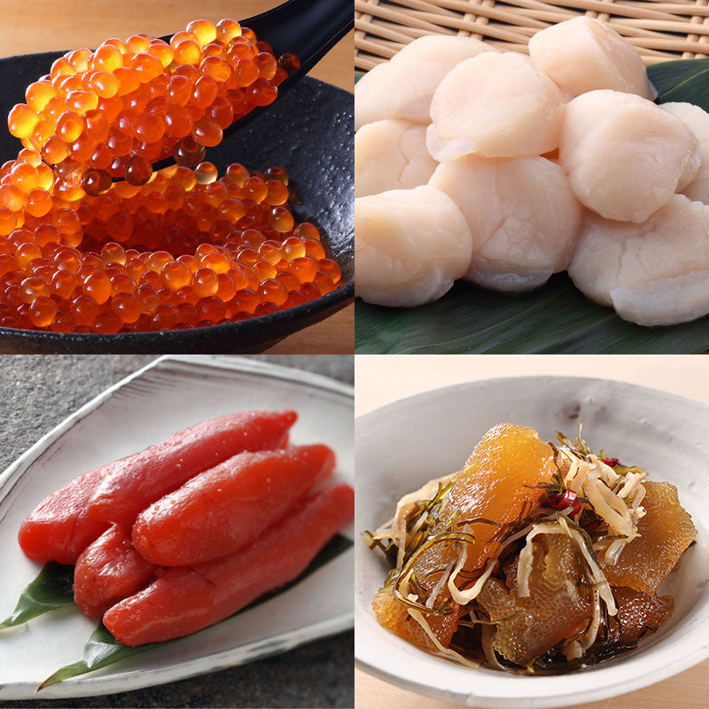 内容量 | 銀鮭いくら醤油漬250g、刺身ほたて貝柱500、 塩たらこ300g、数の子70%入松前漬け180g |
